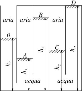 Svolgimento. Il problema viene risolto applicando ripetutamente la legge di Stevino, a partire dalla superficie \(0\) sulla quale agisce la pressione ambiente \(P_0\). Nella legge di Stevino è necessario prestare attenzione ad usare la densità del fluido che mette in collegamento i due punti considerati. I punti \(A\) e \(B\) sono messi in collegamento con il punto \(0\) dall’acqua. I punti \(B\) e \(C\) sono messi in collegamento tra di loro dall’aria. I punti \(C\) e \(D\) di nuovo dall’acqua. La soluzione del problema è quindi