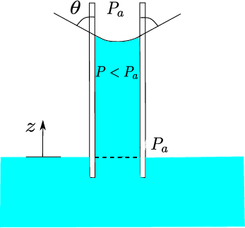 The capillarity effect is more significant for narrow tubes (inverse proportionality with \(1/r\)). The height \(h\) can be either positive or negative depending on the contact angle: \(h \le 0\) for \(\theta \ge \pi/2\).Calculate the pressure in the fluid at the top of the column using Stevin’s law: