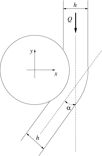 Un getto d’acqua (\(\rho=999\ kg/m^3\)) stazionario, piano e orizzontale viene indirizzato su un cilindro, lambendone la superficie e venendo deviato di un angolo \(\alpha =15^\circ\). Determinare la forza agente su una porzione del cilindro di lunghezza pari a \(H = 2\ m\), dovuta sia al getto d’acqua, sia all’aria circostante, sapendo che: \begin{itemize} \item il fluido che circonda il getto e il cilindro `e aria in quiete a pressione atmosferica di \(101325\ Pa\); \item la larghezza del getto `e \(h=2\ cm\); \item la portata d’acqua per unit`a di lunghezza nel getto `e \(Q = 199\ kg\ m^{-1}\ s^{-1}\). \end{itemize} Sufficientemente lontano dal cilindro, il profilo di velocità sulle sezioni del getto è uniforme. Illustrare tutte le ipotesi semplificative adottate nella risoluzione dell’esercizio.