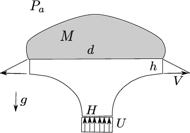 Un getto d’acqua (\(\rho=999\ kg/m^3 \)) stazionario, piano e verticale viene indirizzato su un oggetto di massa \(M\), tenuto da esso in equilibrio. Il getto ha distribuzione di velocità uniforme \(U\) lungo lo spessore \(H\), mentre la distribuzione sul bordo dell’oggetto è triangolare di spessore \(h\) con velocità massima \(V\). Si calcoli la velocità \(V\) e la massa \(M\) dell’oggetto supponendo che: \begin{itemize} \item il fluido che circonda il getto e il solido `e aria in quiete a pressione atmosferica di \(P_a = 101325\ Pa\); \item si possa trascurare la gravità nel bilancio di quantità di moto, ma non nell’equilibrio del corpo. \end{itemize}