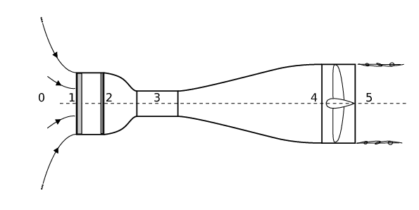 Viene chiesto di determinare la potenza dei motori della galleria a circuito aperto rappresentata in figura, sapendo che la velocità massima desiderata nella sezione di prova è \(V_{test} = 30 \, m/s\), l’area della sezione di prova è \(A_{test} = 1.0 \, m^2\) e l’area della sezione in cui è alloggiato il ventilatore che mette in moto l’aria è \(A_{fan} = 2.0 \, m^2\). Si supponga che la corrente sia incomprimibile e che la densità dell’aria sia \(\rho = 1.1 \, kg/m^3\). In una prima fase, si trascuri la caduta di pressione attraverso il nido d’ape e gli schermi presenti tra la sezione 1 e la sezione 2 del condotto. Successivamente si ripeta il calcolo con una caduta di pressione \(P_1 - P_2 = k \rho U^2\), con \(k = \dots\).