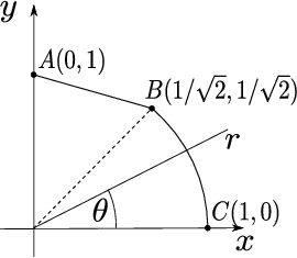 determinare il flusso attraverso il segmento che va dal punto \(A=(x_A,y_A)= (0,1)\) al punto \(B=(x_B,y_B)=(1/\sqrt{2},1/\sqrt{2})\) e il flusso attraverso l’arco di circonferenza centrata nell’origine, da \(B\) a \(C=(x_C,y_C)=(1,0)\). Discutere il risultato;
