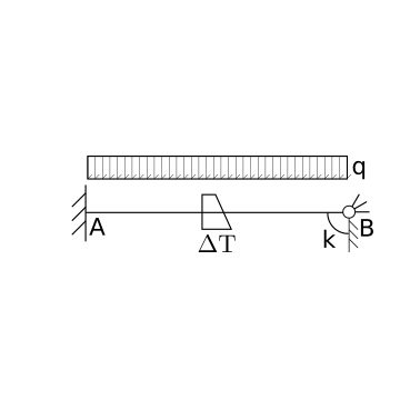 Method 2 - PCVW. Differently from previous problems, the real displacements are not identically zero as the rotation \(\theta_B\) is not rigidly constrained to be zero, but this rotation is contrasted by an elastic spring introducing a real benging moment \(M_B = - k \theta_B\) into the beam. The principle of complementary virtual work reads