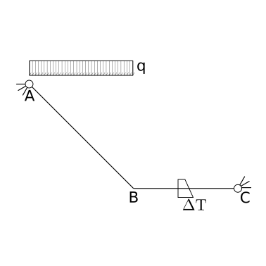 …as the reactions from the springs are unknown, the structure can be considered as three times hyperstatic (\(3\) beams: \(3 \times 3 = 9\) d.o.f., \(12\) d.o.c., \(12-9 = 3\) actual d.o.c.; todo: explicitly prove that there’s no rigid degree of freedom…)