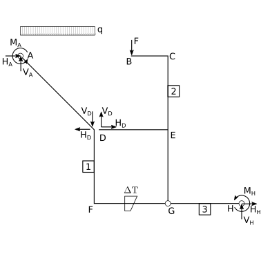 i.e. a linear system that is 3 times under-determined (in agreement with the 3 hyperstatics evaluated above). Here the independent unknown hyperstatics are chosen to be \(V_D\), \(M_A\), \(M_H\), and thus