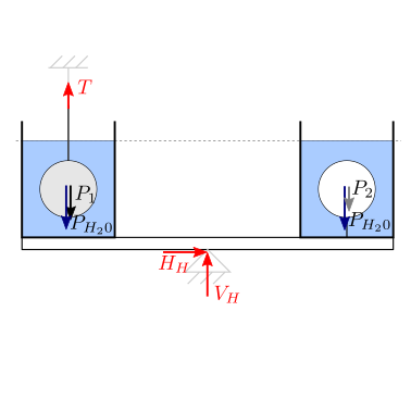 Due corpi sferici di pari volume e densità \(\rho_1\) e \(\rho_2\) sono immersi in pari volume di acqua di pari densità \(\rho_{H_2 O}\). La geometria del sistema è simmetrica rispetto al piano verticale passante per il polo sulla quale la trave orizzontale è appoggiata. Il corpo \(1\) è connesso a terra da un filo. Il sistema è in un piano verticale e soggetto a un campo gravitazionale uniforme.
