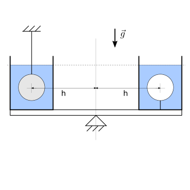 Il sistema è in equilibrio solo se il corpo \(2\) ha densità pari a quella dell’acqua, \(\rho_2 = \rho_{H_2 O}\). Nel caso in cui il corpo \(2\) ha densità minore dell’acqua, \(\rho_2 < \rho_{H_2 O}\), la risultante dei momenti è positiva e - per la convenzione scelta - promuove una rotazione in verso antiorario.